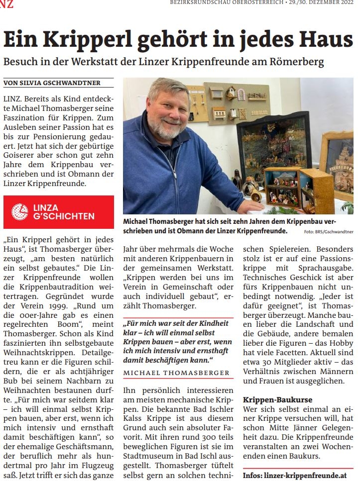 Von Frau Gschwandtner in eine sehr nette Geschichte zusammengfasst erschien nun das Gespräch mit Obmann der Linzer Krippenfreunde, Michael Thomasberger, im ePaper der BezirksRundSchau (hier der Link zum Bericht) und in den Printmedien der BezirksRundSchau Linz, Linz Urfahr und Linz-Umgebung.