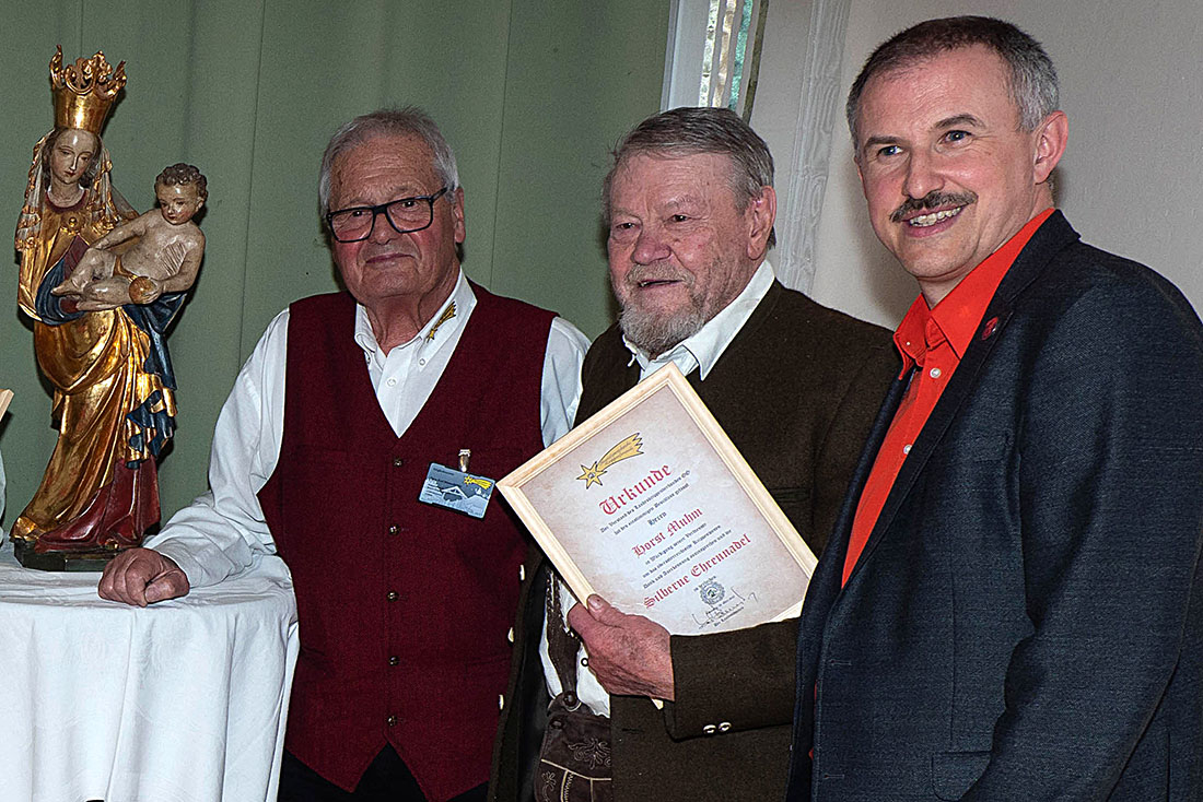 Anlässlich des Landeskrippentages in Eidenberg wurde nun Horst Muhm vom Bundesobmann des Verbandes der Krippenfreunde Österreichs DI(FH) Klaus Gspan und vom Landesobmann der Oberösterreichischen Krippenfreunde Karl Hennerbichler für seinen besonderen Beitrag zur Verbreitung der Volksbildung und Heimatpflege auf dem Sektor des Krippenwesens die Ehrennadel in Silber überreicht. „Unglaublich in wie vielen Wohnzimmern im Mühlviertel in der Weihnachtszeit Krippen aufgestellt werden, die unter der Anleitung von Horst Muhm gebaut wurden. Er hat es sich redlich verdient.“, so auch Bürgermeister Adi Hinterhölzl bei der Verleihung der Ehrennadel in Silber.