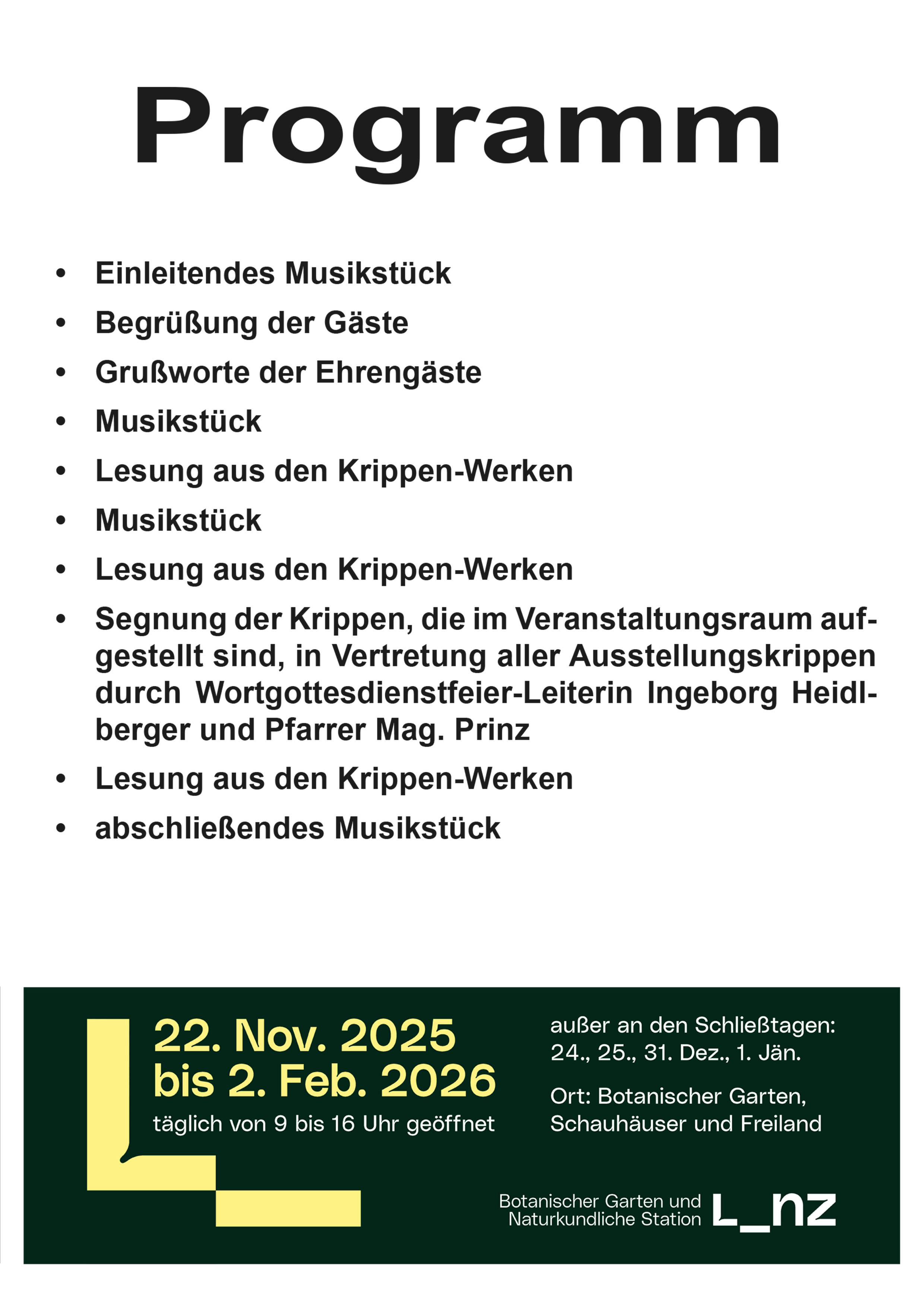 Die Eröffnung der Krippenausstellung 2025 findet am Freitag, 21. November 2025 um 15:30 Uhr im Botanischen Garten im Seminarraum statt.