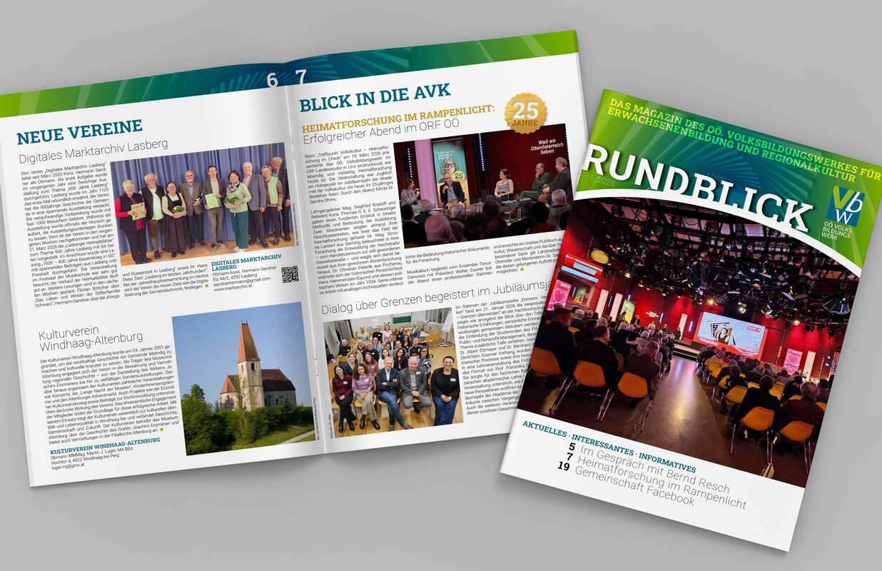Manchmal braucht es nur ein gutes Magazin und eine Tasse Kaffee, um gedanklich auf Entdeckungsreise zu gehen: genau dafür ist die neue Ausgabe unseres Rundblicks da. Die Verbandszeitschrift des OÖ. Volksbildungswerkes ist ab sofort online verfügbar. Zweimal jährlich bietet das Magazin spannende Einblicke in Erwachsenenbildung und Regionalkultur in Oberösterreich. Auch diese Ausgabe überzeugt mit vielfältigen Inhalten: Freuen Sie sich auf ein interessantes Gespräch mit Bernd Resch von der IT:U, Einblicke auf der Heimatforscherseite, inspirierende Büchertipps sowie einen praktischen Vereinstipp. Ergänzt wird das Ganze durch vielfältige Artikel unserer Vereinslandschaft und die Vorstellung neuer Mitgliedsvereine. Die aktuelle Ausgabe ist online abrufbar. Die gedruckte Version kann bei Bedarf gerne im Büro bestellt werden.