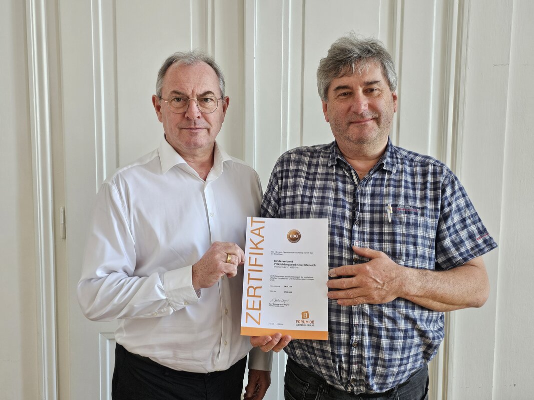 Qualitätssicherung spielt in der oö. Erwachsenenbildung eine zentrale Rolle. Um Bildungsangebote transparent, vergleichbar und kontinuierlich weiterzuentwickeln, werden anerkannte Erwachsenenbildungseinrichtungen regelmäßig einem standardisierten Qualitätsverfahren unterzogen. Dieses Verfahren wird seit 1999 vom Institut für Berufs- und Erwachsenenbildungsforschung (IBE) in Zusammenarbeit mit dem EB‑Forum OÖ durchgeführt und basiert auf den Kriterien des österreichischen Qualitätsrahmens für die Erwachsenenbildung (Ö‑Cert). Am 27. November 2025 erfolgte das Audit durch Nicole Sonnleitner. Qualitätsmanager Thomas Scheuringer bereitete sämtliche erforderlichen Unterlagen vor und konnte den umfangreichen Fragenkatalog zur vollsten Zufriedenheit beantworten. Das EBQ-Siegel wurde erfolgreich verlängert und darf in den kommenden Jahren weitergeführt werden. Die geforderten 100 Prozent der Bewertungspunkte wurden erneut erreicht. Zudem wurden zwei Mitgliedsvereine auditiert und dürfen künftig ebenfalls das EBQ-Siegel führen: Naturschule St. Veit und Österreichisches Sattlermuseum.